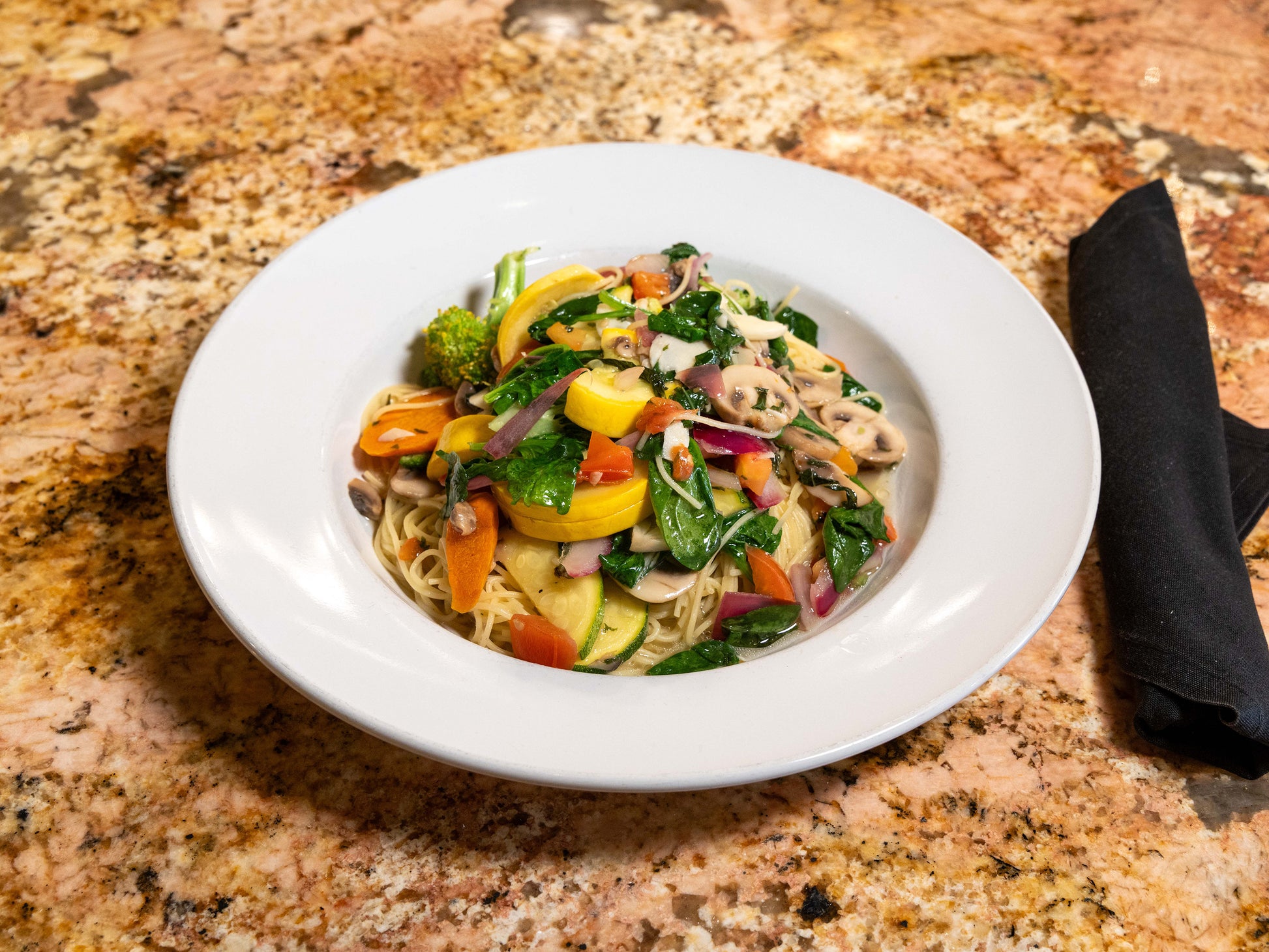 Experience Capellini Primavera—a delightful medley of sautéed mushrooms, flavorful vegetables, onions, juicy cherry tomatoes, and crisp broccoli, all tossed in a fragrant olive oil and garlic sauce.