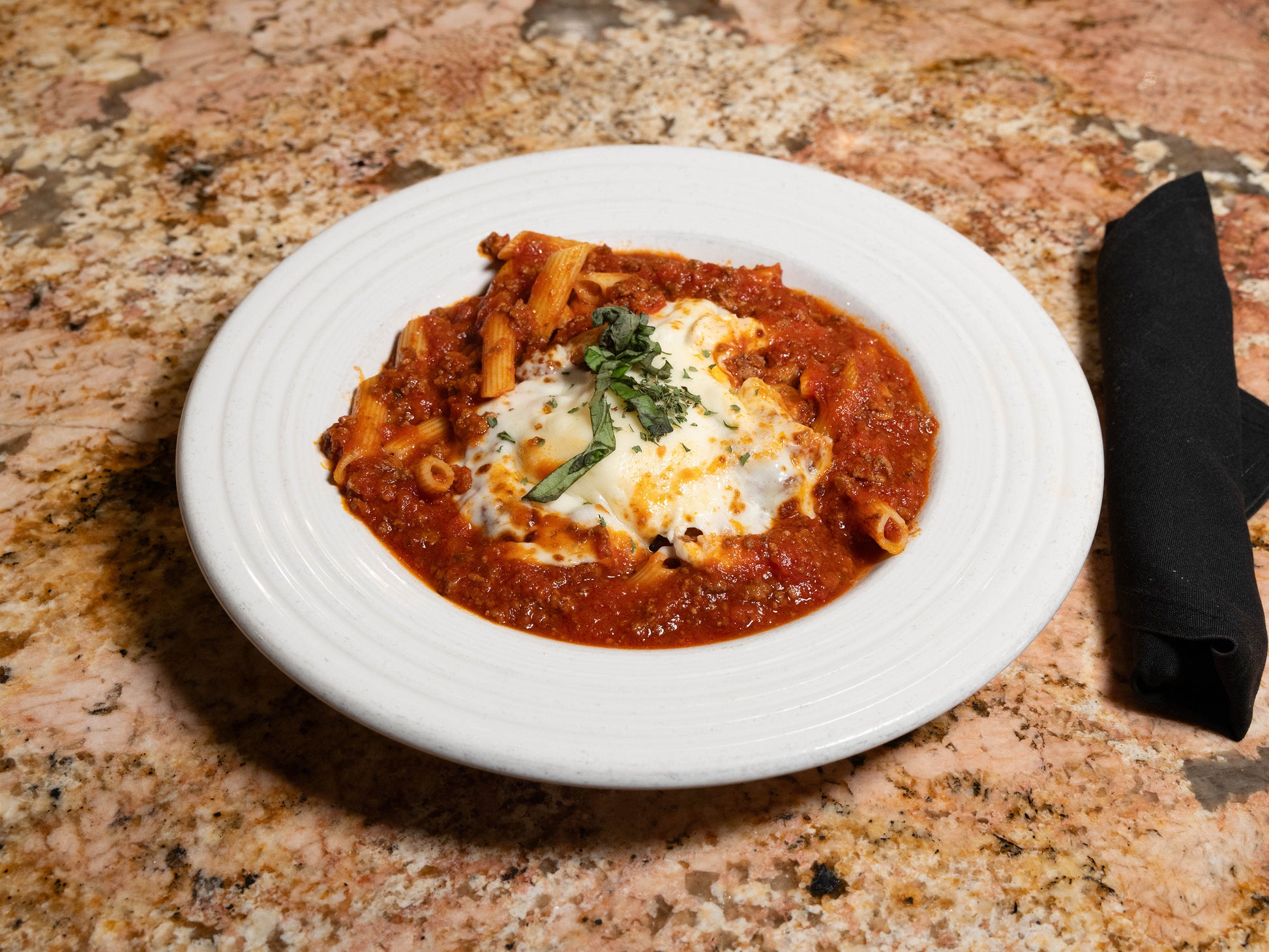 Savor penne pasta mixed with rich meat sauce and crowned with fresh ricotta and melted mozzarella cheese in Vincenzo’s Specialty.
